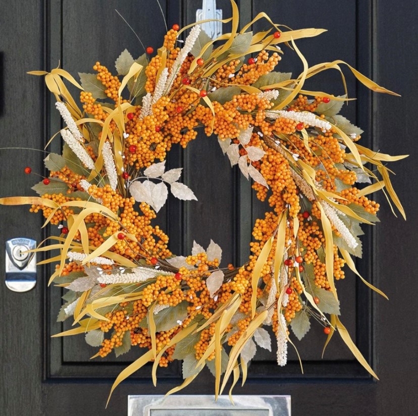 Front Door Wreath With Berries, Artificial Leaves, and Grain - Harvest Wheat (Amazon)