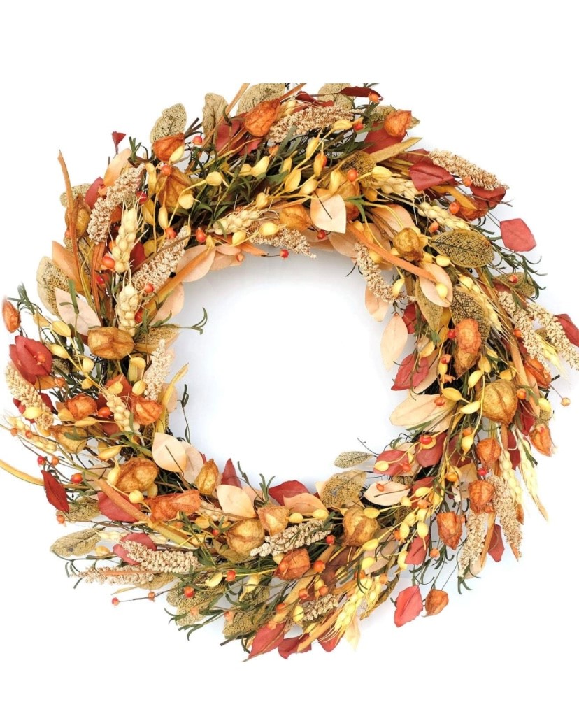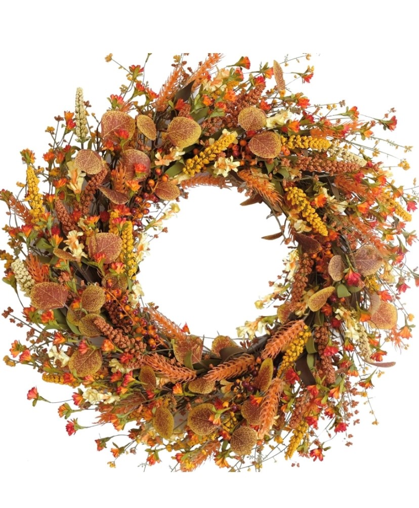 Bibelot Fall Wreath with Flowers, Grain, Eucalyptus Leaves - Autumn, Harvest, Thanksgiving Decor (Amazon)